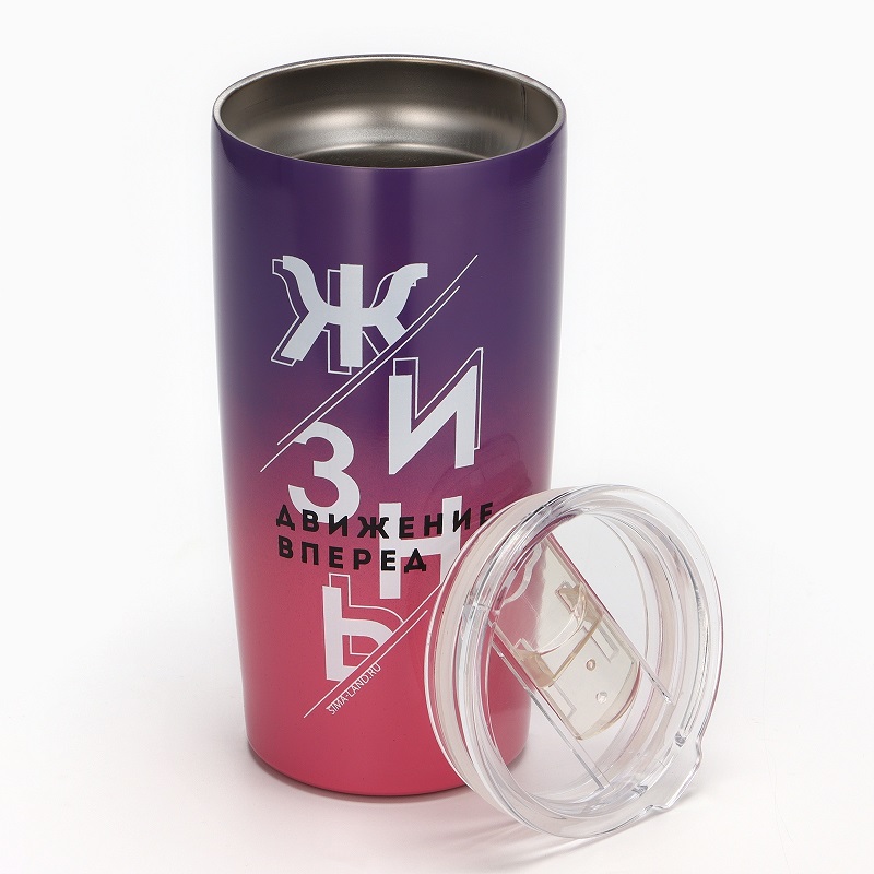 Крышка позволяет пить в дороге. В ней имеется небольшое отверстие, которое оснащено пластиковой задвижкой (отверстие для питья). Это исключает выплёскивание жидкости и позволяет использовать её во время пеших прогулок или поездке в автомобиле. При желании Вы можете снять крышку.