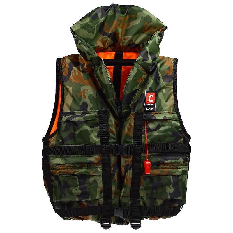 Спасательный жилет Comfort Captain — двухсторонний спасательный жилет, лицевая сторона выполнена в цвете камуфляж, внутренняя сторона сигнального ярко оранжевого цвета. На камуфляжной стороне расположены 6 карманов на молнии, с оранжевой стороны еще 4 кармана на молнии.