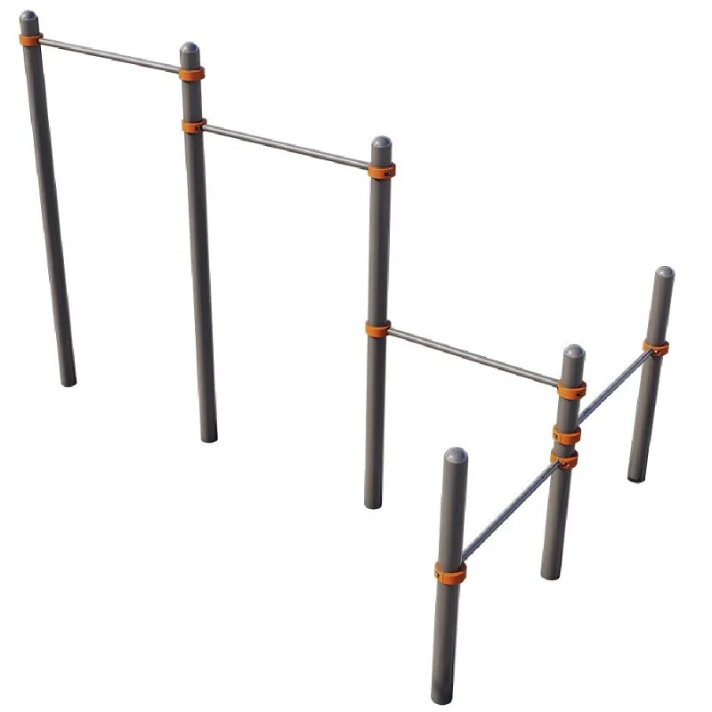 5-ти турников 1200 мм диаметром 34 мм, расположенных на высоте 2300мм, 2100мм, 1200мм, 1000мм, 200мм от поверхности основания.